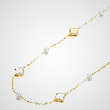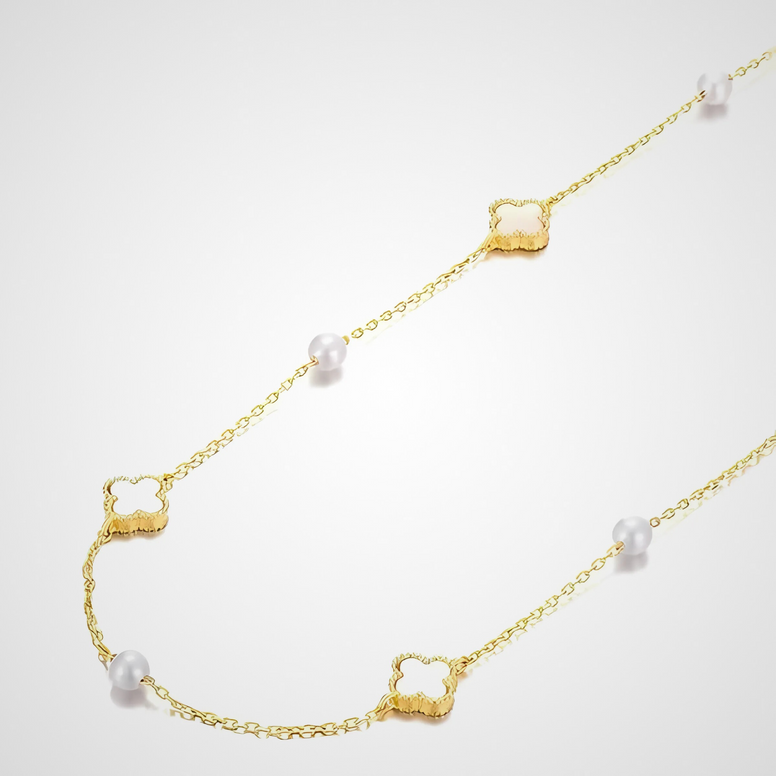 Zeitlose Halskette mit 7 mm MOP-Kleeblattperlen und 4 mm Süßwasserperlen. Gefertigt aus massivem Sterling Silber mit 18K Gold-Vermeil oder Silber für langlebigen Glanz. Gesamtlänge 40 + 5 cm, vielseitig kombinierbar für lässige oder elegante Looks.