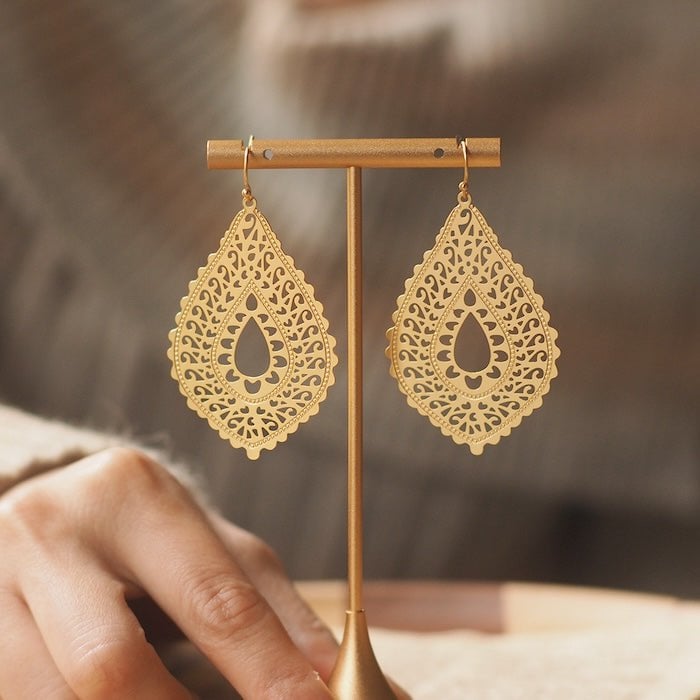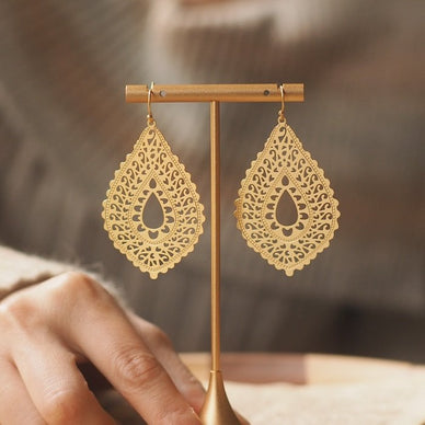 Mit ihren aufwendigen, filigranen Details fangen sie die Essenz des Charmes der alten Welt ein und verleihen Ihrem Look gleichzeitig einen Hauch von Bohème-Flair. Mit großen Blumenmotiven in einem zarten Hohlrahmen setzen diese Ohrringe mit ihrem klobigen und dennoch anmutigen Design ein mutiges Statement. Die Messingkonstruktion ist mit einer luxuriösen Vergoldung versehen. Jedes Paar Ohrringe ist ein Beweis für handwerkliche Handwerkskunst und Qualität. Mit den Maßen 6,2 x 3,5 cm erregen sie Aufmerksamkeit, ohne Ihren Stil zu überfordern, und schaffen die perfekte Balance zwischen Aussagekraft und tragbarer Eleganz.