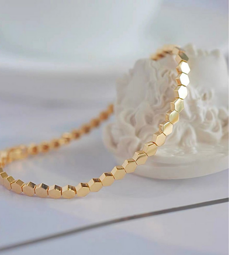 Dieses mit Präzision gefertigte schlanke und moderne Stück verfügt über ineinandergreifende Sechskantelemente in einem strahlenden goldenen Vermeil Finish. Sein geometrisches Design fügt eine zeitgemäße Kante hinzu und macht gleichzeitig eine minimalistische Eleganz, wodurch es zu einem vielseitigen Accessoire für den täglichen Verschleiß oder eine Schichtung mit anderen Armbändern ist. Mit einer Gesamtlänge von 17 cm bietet es eine komfortable Passform und einen raffinierten Look. Perfekt für diejenigen, die klare Linien und subtile Raffinesse schätzen. Ein einzigartiges und nachdenkliches Geschenk für sie, die zeitlose Einfachheit mit modernem Charme kombiniert.