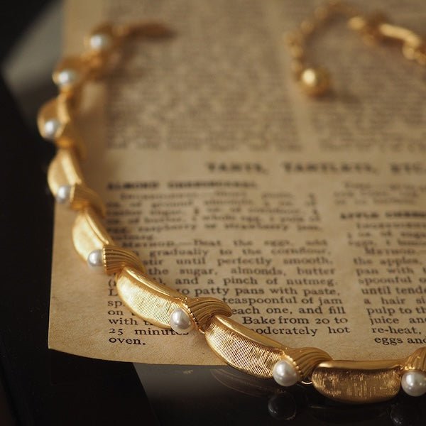 Diese elegante Vintage-Perlenband-Halskette mit Goldfinish und zarten Süßwasserperlen vereint zeitlose Eleganz mit einem auffälligen Band- und Blattdesign. Verstellbar (37 + 10 cm), perfekt für besondere Anlässe oder den Alltag.